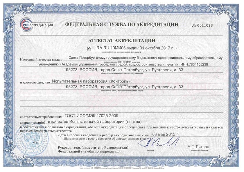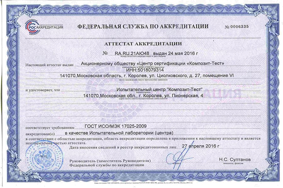 Аттестат № RA.RU.10МИ05 в области: строительные материалы, в частности щебень, песок, сухие смеси, цемент, кирпич и прочее